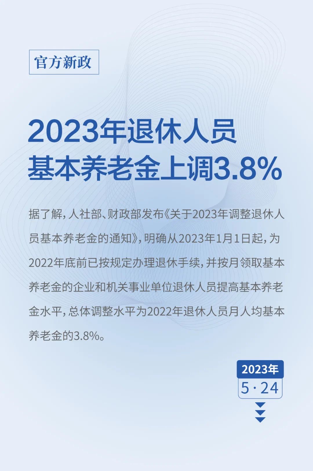 全国调整比例按照2022年退休人员月人均基本养老金的3.8%确定。各省以全国调整比例为高限确定本省调整比例和水平。