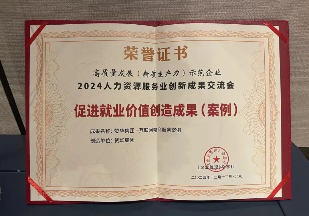赞华集团作为受邀嘉宾,出席了此次盛会。凭借其在人力资源服务领域的卓越创新实践,赞华集团的《互联网电商服务案例》在众多案例中脱颖而出,荣获了促进就业价值创造成果(案例)奖项。这一荣誉不仅彰显了赞华集团在推动社会高质量就业方面的积极贡献,也充分展示了其在国企改革创新进程中的引领作用和示范效应。