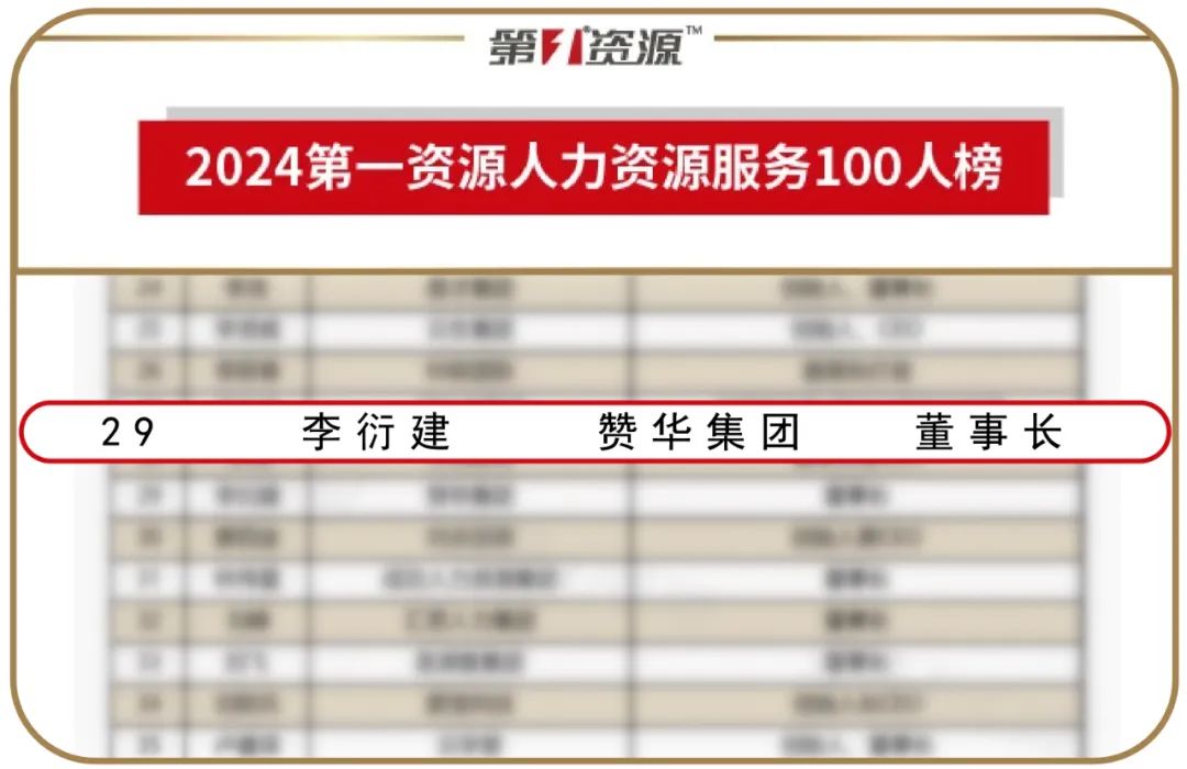 2024年8月18日这个中国人力资源日的重要时刻,赞华集团董事长李衍建凭借其卓越的领导力和在人力资源服务领域的杰出贡献,荣登“2024第一资源人力资源服务100人榜”!