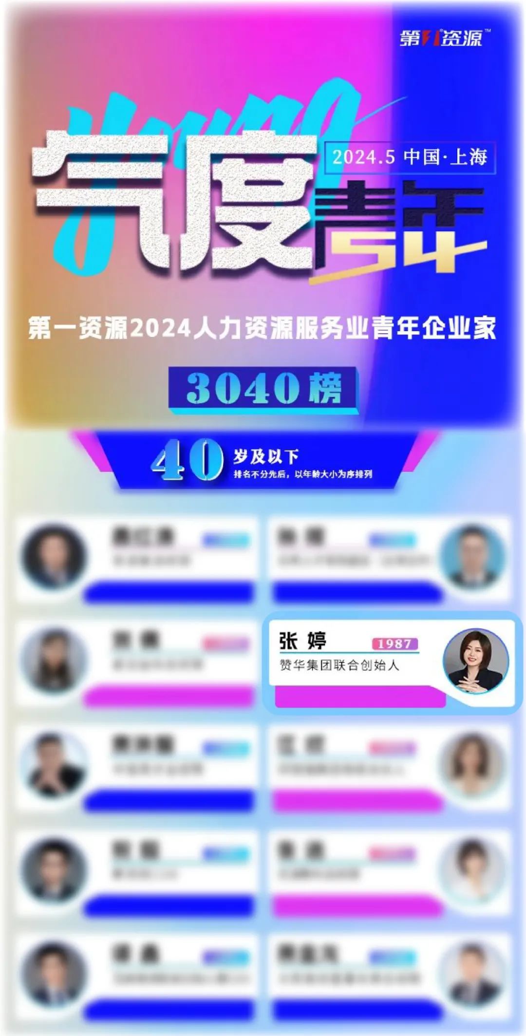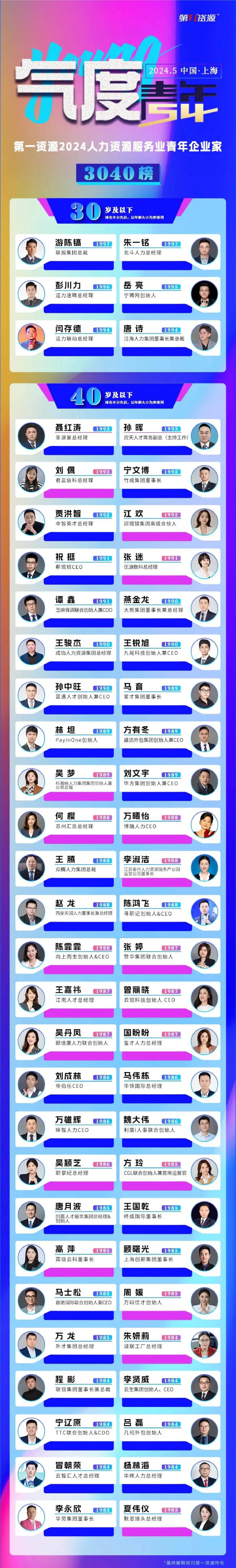 为了表彰青年企业家并以榜样力量带领中国人力资源服务业快速前行,2024年5月4日,第一资源发布“2024人力资源服务业青年企业家3040榜”,榜单从个人优势、卓越成就、公司经营业绩等多个综合维度考察人选,甄选出业内实至名归的30岁及以下与40岁及以下的青年企业家。