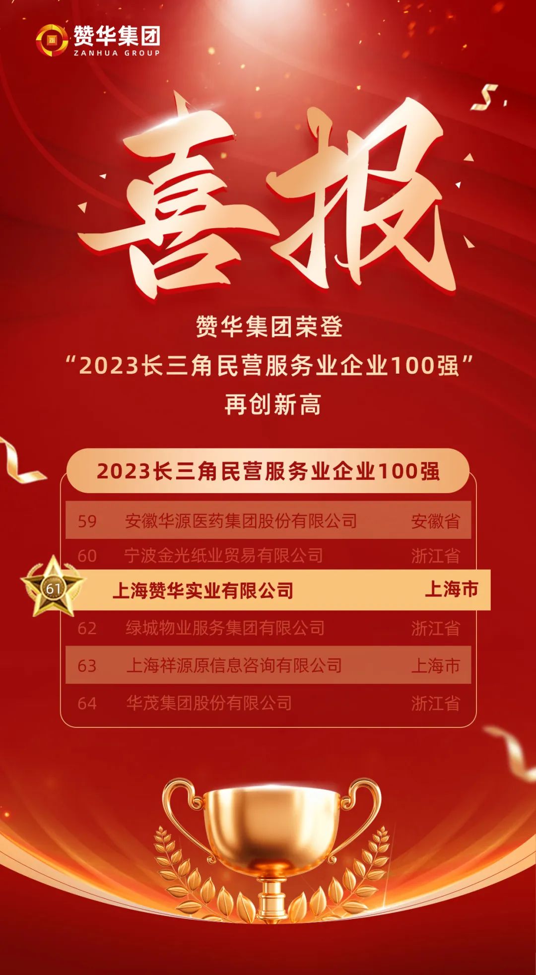 喜报!赞华集团荣登“2023长三角民营服务业企业100强”,再创新高!!!