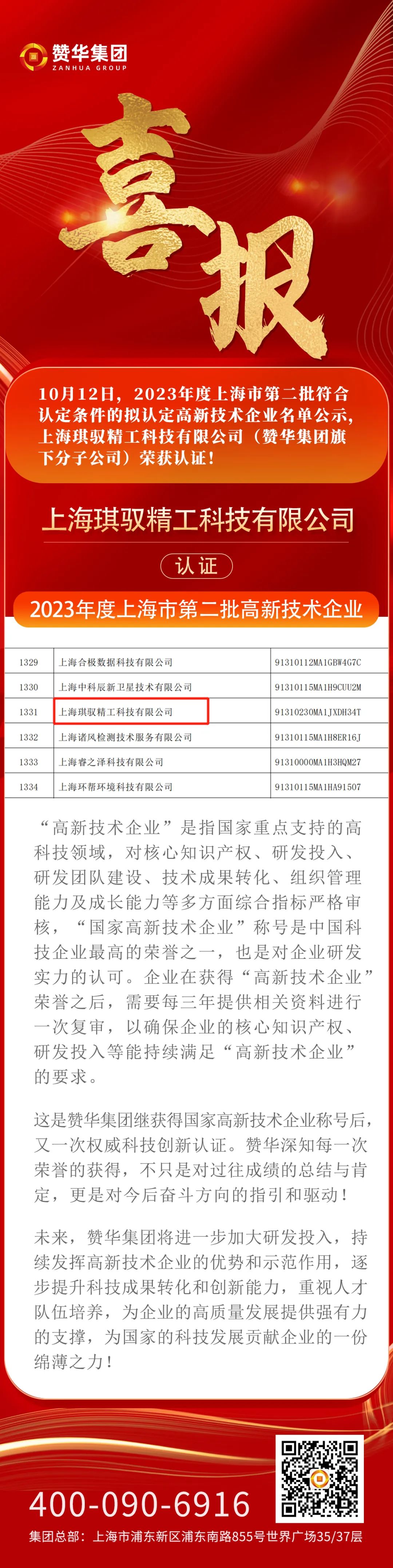 喜报 | 赞华集团旗下分子公司荣获上海市“高新技术企业”认证