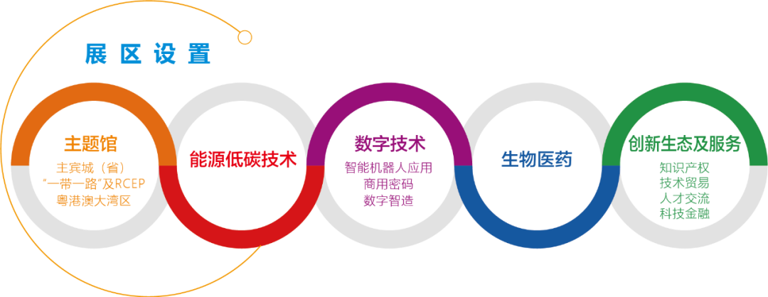 设置主题馆、能源低碳技术、数字技术、生物医药、创新生态及服务五大展区。主题馆展区将展示主宾城(省)的前沿科技和创新成果,并汇聚全国各省区市“一带一路”技术创新合作成果。能源低碳技术展区围绕碳达峰碳中和,集中展示煤电转型方案及核电、氢能等领域的零碳新技术。数字技术展区围绕“数字中国”建设规划布局,聚焦商用密码、智能机器人、数字智造等领域,展示最新数字技术应用成果。生物医药展区围绕关系民生福祉的重点领域,展示生物医药、医疗器械、新材料等领域的技术交叉应用。创新生态及服务展区打造覆盖技术交易全链条的配套服务体系,推出覆盖成果转化、创业孵化、科技投融资、上市培育、法律咨询、人才引进等技术贸易全周期各环节的综合服务。